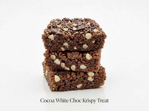 A rich, dessert-inspired take on the classic marshmallow square. This Cocoa & White Chocolate Krispy Treat blends crisp rice cereal with soft vanilla marshmallow and deep cocoa notes, finished with smooth pieces of creamy white chocolate for a balanced chocolate profile. The result is a treat that delivers both light crunch and soft chew, with layers of chocolate sweetness in every bite. Infused with premium cannabis oil, this edible provides a smooth and consistent alternative to smoking or vaping. The cocoa and white chocolate combine to create a rich, rounded flavor that complements the infusion while keeping the overall taste smooth and enjoyable. The result is a carefully crafted edible that pairs indulgent chocolate flavor with a measured cannabis infusion. Familiar in texture yet elevated in composition, each square offers a balanced blend of sweetness, richness, and a refined edible experience.